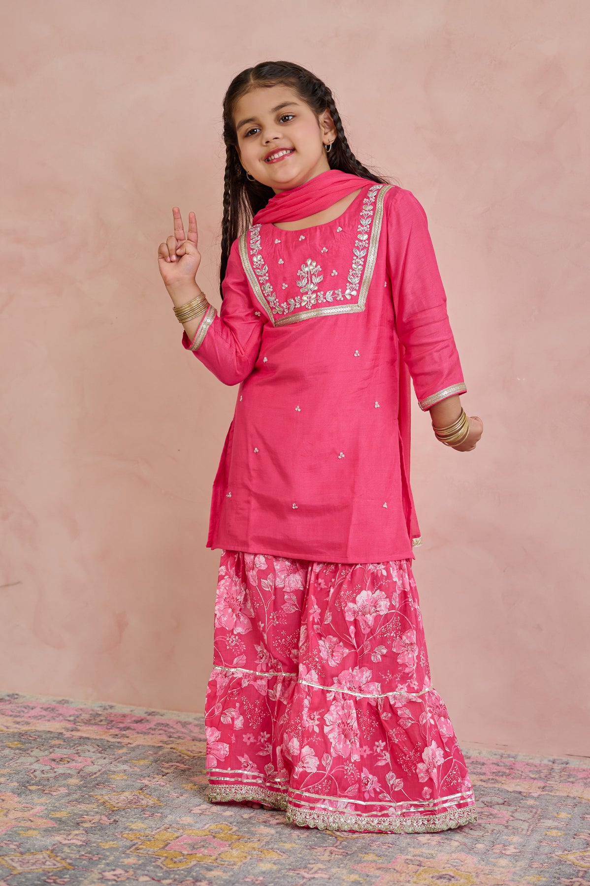 GIRLS PINK MUSLIN GOTA PATTI WORK KURTI WITH SHARARA AND DUPATTA (SET OF 3)