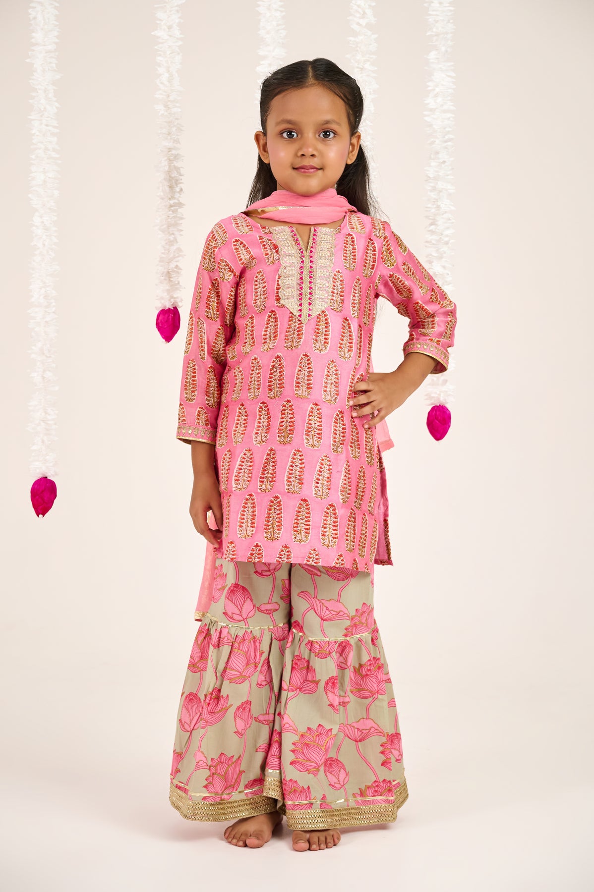 GIRLS PINK BUTI HANDBLOCK CHANDERI KURTI WITH FLORAL COTTON SHARARA AND DUPATTA (SET OF 3)