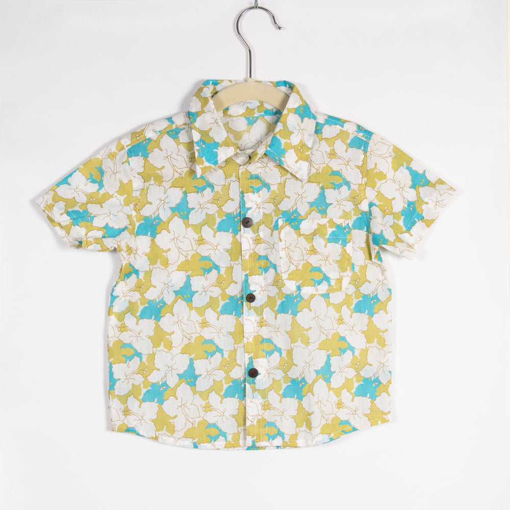 BOYS  GREEN WHITE FLORAL SHIRT WITH SHORTS CO-ORD SET